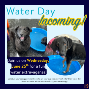 Water pools and toys will be out in the rooms from 9 AM to 11 AM! This will ensure for enough time for your pup to fully dry before going home! Spa appointments will fill up quickly, so make sure to schedule yours now!