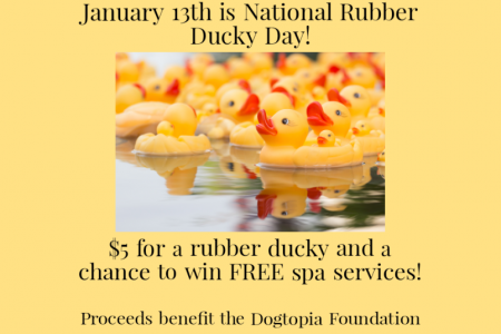 Support the Dogtopia Foundation on January 13th by buying a rubber duckie for $5. Each duckie is a chance to win a spa service! Come on in for details.