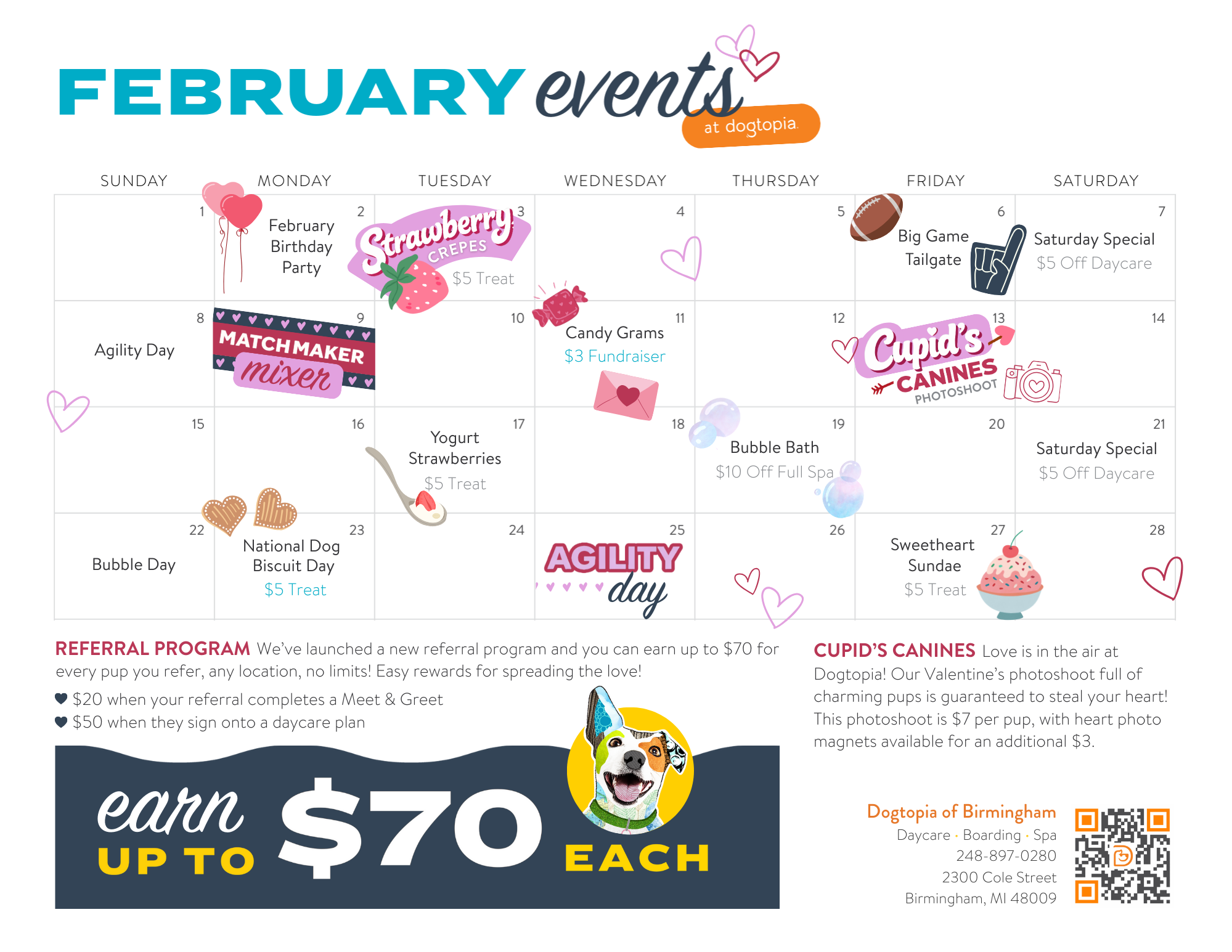 Puppy love is in the air at Dogtopia! We have tons of fun enrichment events for our dogs this month including special treat days, agility, photoshoots, and discounts. Take a look at what we’ve got coming up!