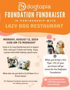 Join our Dogtopia Foundation Fundraiser in Partnership with Lazy Dog Restaurant.