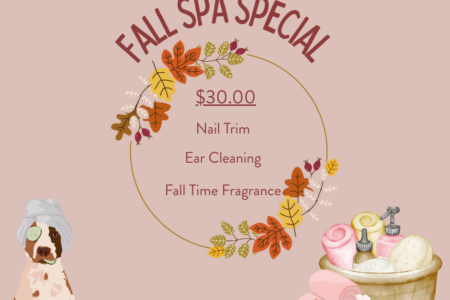 Treat your pup to some fall-time pampering! For just $30, our Fall Spa Special includes a nail trim, ear cleaning, and a cozy seasonal fragrance to keep your dog looking and smelling their best. Give your furry friend the ultimate autumn refresh and book their spot in the app!