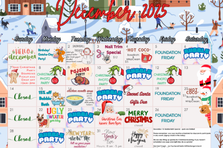 Check our monthly calendar and follow us on social media for updates. Want your pup to join in? Book a daycare day or schedule a Meet & Greet today!