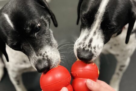 De-LICK-cious Specialty Kongs for lunch made with peanut butter, banana, honey, and blueberries.