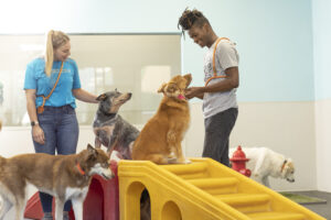 Dogtopia is an all-day open-play facility. We don’t keep your pups in crates, kennels, or dog runs. Instead, they spend their day in an off-leash dog park environment, playing with their furry friends.