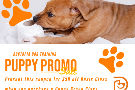 As you may have already heard, we now offer training out of Dogtopia of Sandy Springs! In honor of National Puppy Day on March 23rd, we’re offering a special training discount for all pups under 1 year old. Enroll your pup in our Puppy Group Training Class between 3/14 and 3/23 to and receive $50 off our Basic Group Training Class!