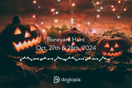 October 27th and 28th is our boneyard hunt! We are setting up a scavenger hunt for dog treats in our outdoor play area! Dogs will hunt for “bones” one at a time outside in our decorated outdoor area!