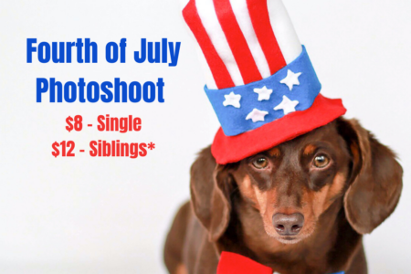 Celebrate Independence Day in style with our festive Fourth of July Photoshoot! While costumes and outfits are completely optional, they’re always encouraged for that extra flair. Single dog photos are $8, and sibling photos are $12. Our team will do their best to capture siblings together, depending on each pup’s cooperation. If a group shot isn’t possible, individual photos will be taken and charged separately.
