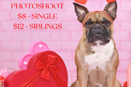 Capture the love this Valentine’s Day! As usual, costumes and outfits are always encouraged but never required. Single photos are $8, and sibling photos are $12, provided cooperation from each dog.