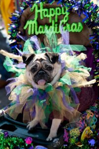 Encourage your pup’s inner exhibitionist by decking them out in traditional Mardi Gras Colors of green, purple, and gold