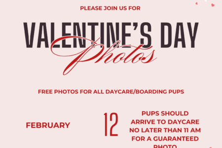 Free festive photos for all daycare and boarding pups! Daycare pups must arrive no later than 11am for a guaranteed photo. Optional Valentines 2026 memorabilia add-on available. ❤️
