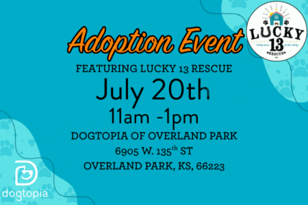 Looking for an addition to your family? Come visit us for a special adoption event featuring Lucky 13 Rescue and their adorable adoptable dogs! All dogs are spayed/neutered, fully vaccinated, microchipped, and heartworm-negative! Any pup adopted during the event will receive a FREE New Customer Starter Package to use at our facility after they’ve been in home for 30 days and a Dogtopia swag bag!
