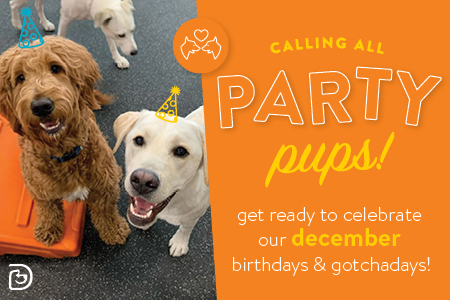 We’ll celebrate with a birthday/gotcha’ day photo, a treat voucher from Woofgang Bakery and Grooming of Overland Park, a 1lb sample of food from A Pup Above, and $15 off a 60 minute massage with TAG Canine Massage when you schedule your pup for a FULL day of play December 8th!