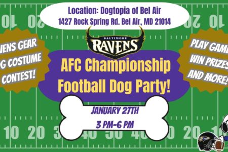 We will be hosting a Ravens AFC Championship Football Dog Party on January 27, 2024, starting at 3 PM to get ready for the big game on Sunday! Dress your dog up in their best Ravens gear and join us for some snacks and cheers!