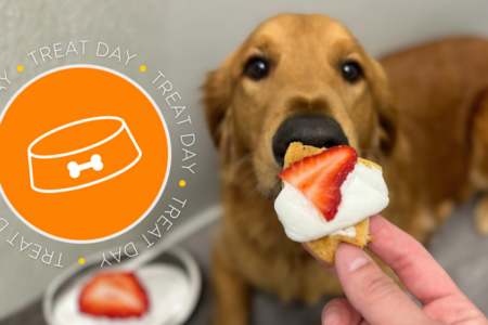 Fresh strawberries coated in Greek yogurt and drizzled with honey give your pup a boost of calcium, antioxidants, and digestive support. This frozen treat is perfect for adding some extra enrichment to your pup’s day!