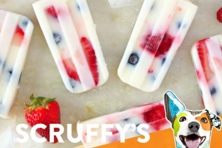 Strawberries, blueberries, and yogurt make the perfect frozen treat. For this month’s Scruffy Snack we will be offering red white and blue pup-cicles. These are a fun way to celebrate Independence Day. Your pup can participate with Scruffy’s Snack all month long for just $5. A tasty and cool snack makes for a nice treat.