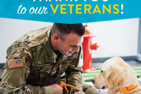 This Veterans Day, we would like to take a moment to say thank you to those who have served and continue to serve our country. Drop off your dog for a Makin’ Bacon event as we raise money to sponsor a service dog for a returned veteran!
