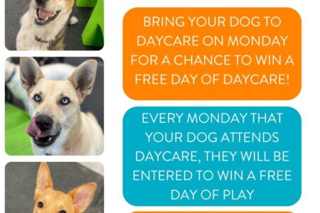 Join us for daycare every Monday for a chance to win a free day of daycare for your pups! All dogs who attend daycare every Monday will be entered to win a free day of daycare every week that they attend!