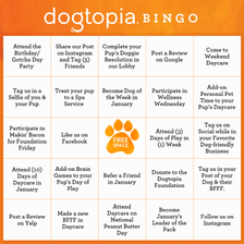 When you’re ready to shout out “BINGO!” with your completed row of (5), hand your card into our Front Desk team. Make sure to submit by the end of January to be entered for your chance to win a Dogtopia prize! Our BINGO winner will be announced in February. NOTE: Every full BINGO card completed wins an extra special treat! To play, pick-up your BINGO card the next time you’re in our lobby.