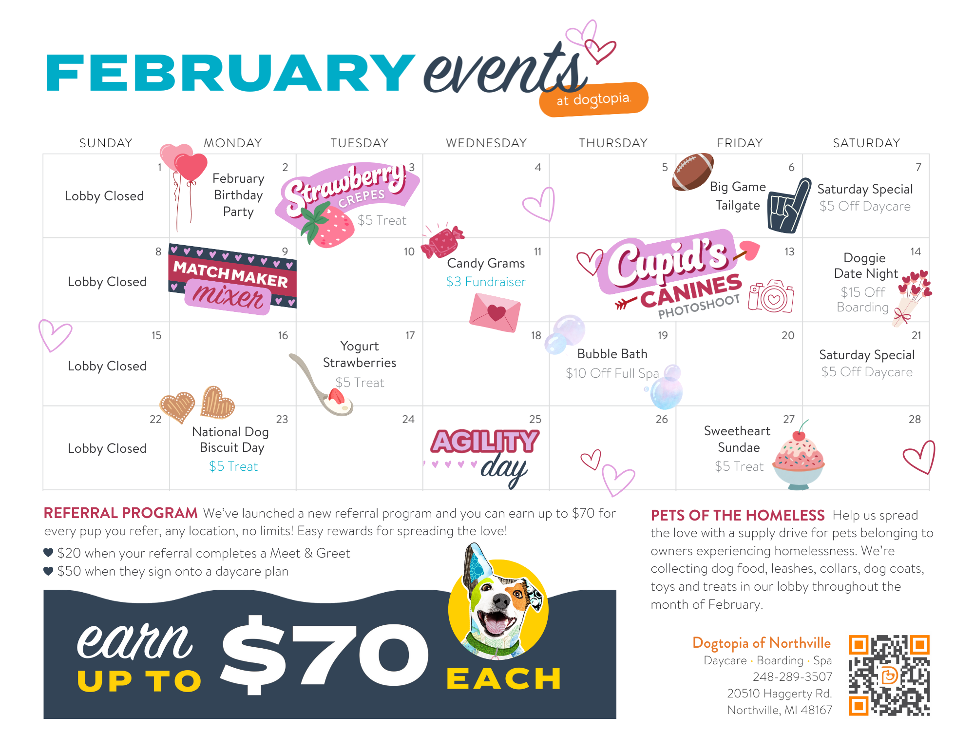 Puppy love is in the air at Dogtopia! We have tons of fun enrichment events for our dogs this month including special treat days, agility, photoshoots, and discounts. Take a look at what we’ve got coming up!