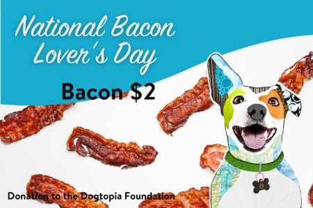 It’s National Bacon Lover’s Day & our pups love Bacon, too! For a $2 donation to the Dogtopia Foundation, your pup can enjoy some bacon at lunch!