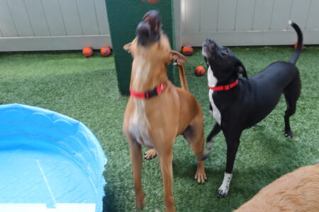 Bring your pup into daycare today and they’ll get to party outside in our awesome ball pit, splash around in our kiddie pools, and have some fun chasing the water hose!