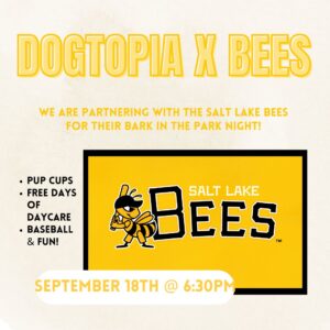 We will be partnering with the Bees for the Bark in the Park! Come enjoy the bees! If you present your ticket from the game we will be giving those individuals a free week of daycare! We are offering complimentary pup cups with peanut butter & whip cream!