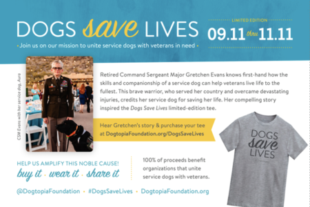 In honor of 9/11, we will be selling limited edition “Dogs Save Lives” t-shirts with all proceeds going to the Dogtopia Foundation to sponsor veteran service dogs to those in need. Inspired by retired Command Sergeant Gretchen Evans, this campaign will help more veterans live life to the fullest.