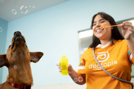 As if going to doggie daycare at Dogtopia wasn’t fun enough, the pups will also get to chase bubbles around the room! Our bubbles are pup-friendly and bacon flavored.