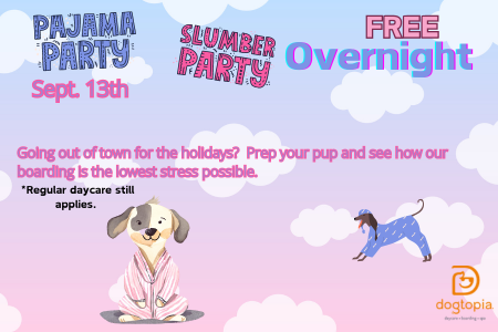 Wanting to see how your dog does overnight? Enjoy an evening out and your pup will enjoy a FREE overnight stay. *Regular daycare required.