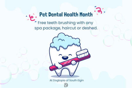 Celebrate Pet Dental Health Month all February long. Dogs with an existing or newly booked spa package, haircut, or deshed appointment may receive a complimentary teeth brushing upon request.