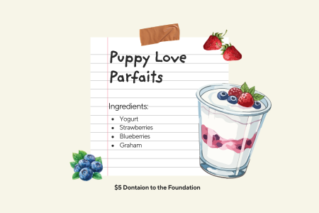 Spread a little puppy love at lunchtime! For a $5 donation to the Dogtopia Foundation, dogs can enjoy a delicious parfait made with Greek yogurt, strawberries, blueberries, and dog-friendly graham. A tasty treat that supports an even sweeter cause.