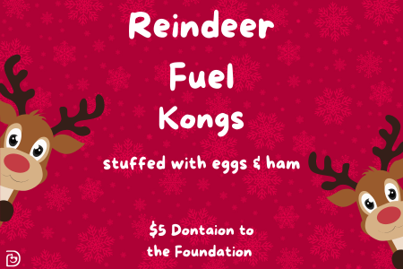 Today we’re offering Reindeer Fuel Kongs stuffed with eggs and ham for a $5 donation to the Dogtopia Foundation. It’s a fun, tasty enrichment option that also helps support the training of service dogs for veterans.