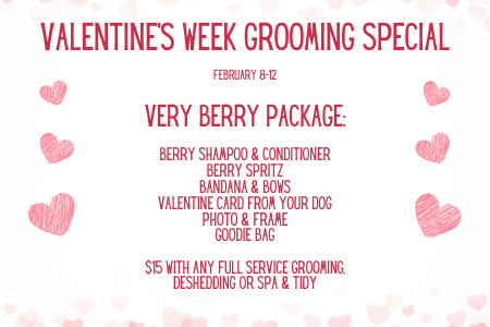 Between February 8-12, we are running the VERY BERRY GROOMING SPECIAL. It will include a berry shampoo and conditioner, berry spritz, bandana and bow, valentine’s day card from your dog, photo and frame and goodie bag. It’s $15 and available on any full service grooming, deshedding or spa and tidy only. Ask for it at check in.