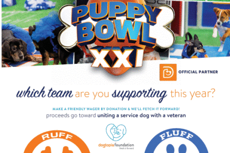 What? Dogtopia is taking bets for the Puppy Bowl? Yes! Well, kind of! Make a friendly wager by dropping a donation in the RUFF or FLUFF team jars in the lobby and let’s see who wins! All proceeds go towards The Dogtopia Foundation for our next service dog!