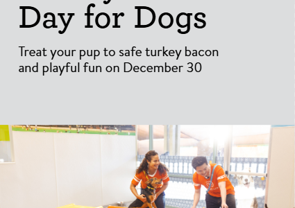 Celebrate the end of the year with Turkey Bacon Day on December 30 at Dogtopia! Your pup will receive a special dog-safe turkey bacon treat during daycare, along with playful enrichment and lots of smiles. Perfect for pet parents looking for fun dog daycare events and safe holiday treats for dogs. Book your pup’s spot today!