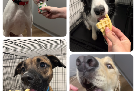 For $3, have your pup enjoy unique homemade treats at lunch time! Look out for our weekly text to sign your dog up or let us know at drop off that your pup would like one.