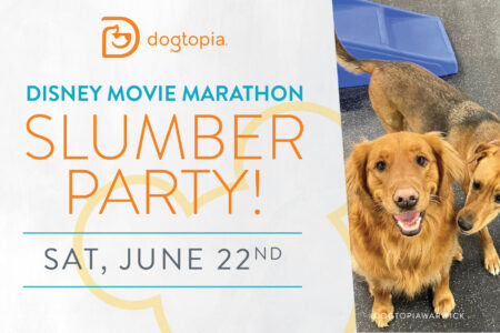 Schedule your pup for an unforgettable overnight stay with their BFFFs! They’ll enjoy open play sessions, a Disney movie marathon (a different movie in each room!), an ice cream snack, and more open play! Plus, they’ll go home with a special Disney-themed goodie bag! Drop off between 10 am – 5 pm on Saturday and pick up between 10 am – Noon on Sunday. Tickets are $50. Reservations required!
